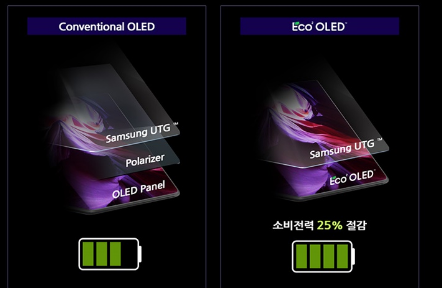 那么什么是生态 OLED?好吧,据三星韩国新闻编辑部称,这是一种新型 OLED 屏幕,现在可以将手机的电池消耗降低 25%。该公司是通过开发一种可防止眩光反射的面板堆叠结构来实现这一目标的。如下图所示,中间的偏光片是显示器的关键材料,被移除了。仅使用三星的超薄玻璃 (UTG) 和 Eco OLED,Galaxy Z Fold3 5G 现在可以自然传输 33% 的光。