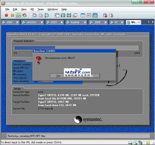 结果GHOST过程中出现:“Decompression error,Abort?” 。运气背?算了,重新来一次,结果情况依旧。