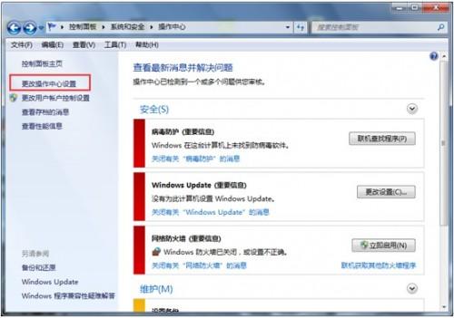 1:依次选择(开始-控制面板-系统安全-操作中心)打开操作中心窗口,单击左上角的“更改操作中心设置”超链接,如图所示。