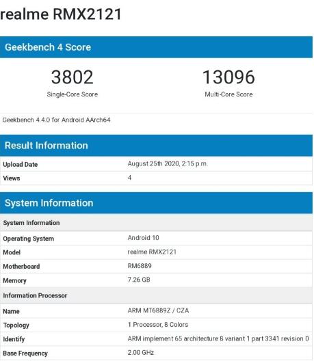 在下面显示的屏幕快照中,Realme RMX2121是Realme X7 Pro的型号。清单显示,智能手机由联发科芯片组提供动力,该芯片组的型号为MT6889Z / ZCA,属于Dimensity 1000+ 5G芯片组。SoC的基本频率为2.0GHz。