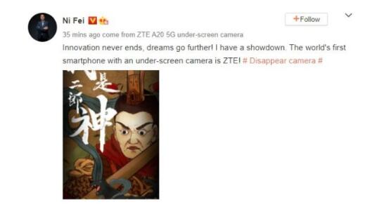 中兴通讯Axon 20 5G将成为全球首款内置摄像头的手机