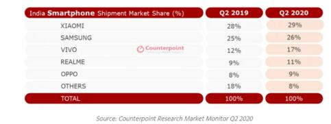 根据Counterpoint Research发布的数据,三星在2020年第二季度抢夺了印度智能手机制造商26%的份额,仅比小米少了3%,小米拥有29%的市场份额。
